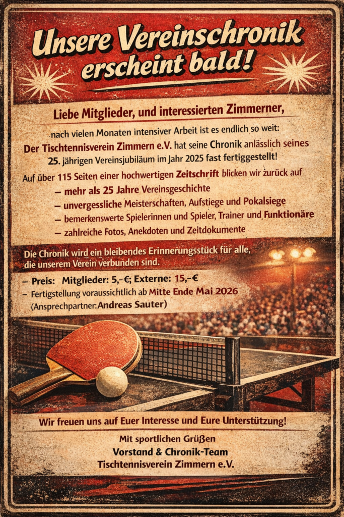 Der Tischtennisverein Zimmern e.V. hat seine Chronik anlässlich seines 25. jährigen Vereinsjubiläum im Jahr 2025 fast fertiggestellt! Auf über 115 Seiten einer hochwertigen Zeitschrift blicken wir zurück auf